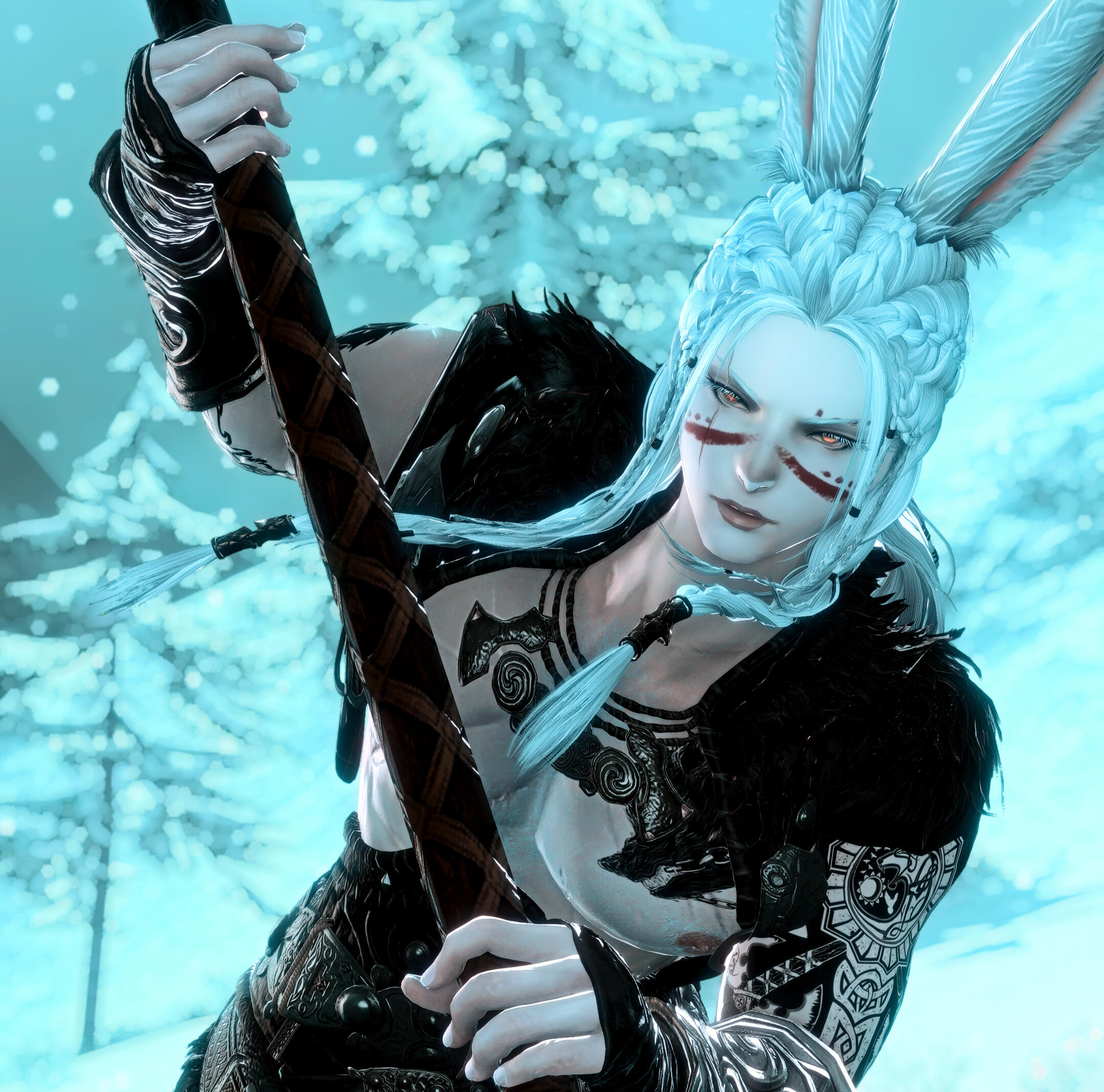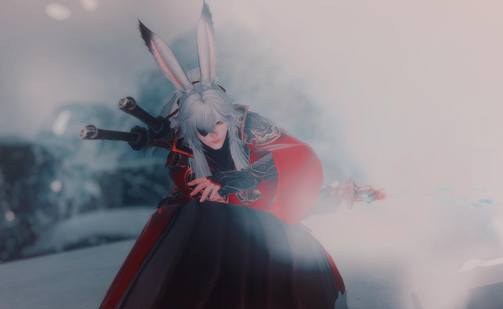 An ominous fur-cloak-donning figure moves about languidly in snow laden forests. A fleecy hood obscuring frosty features reveal naught but the sable-tipped powdery ears of the Viera.Topaz hues beset in a moon-blessed countenance dart forward facing away from what was once home.